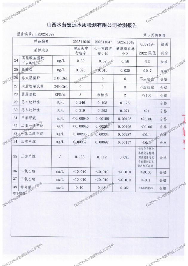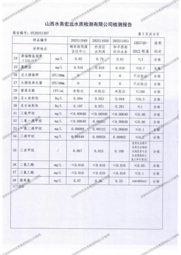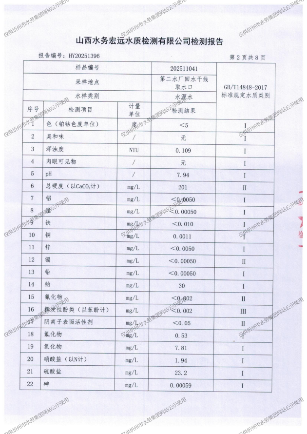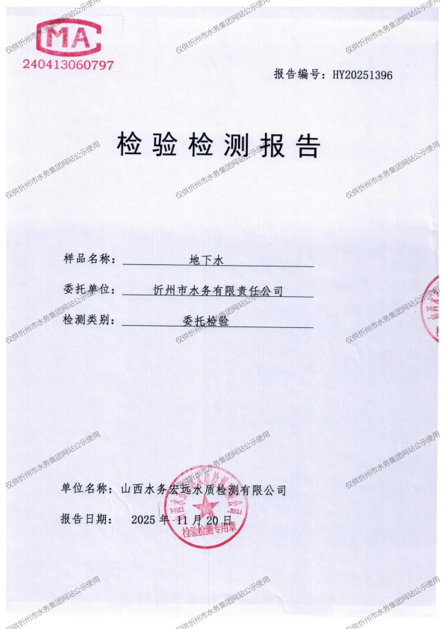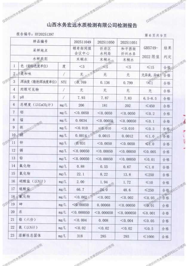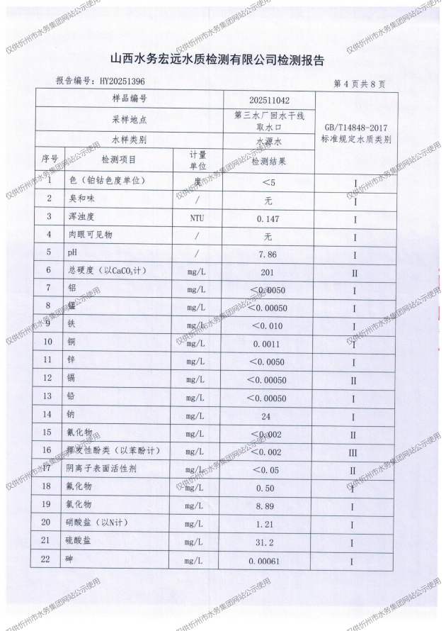 忻州城區(qū)公共供水水源水、出廠水、管網(wǎng)水、管網(wǎng)末梢水2025年11月份水質(zhì)信息公示