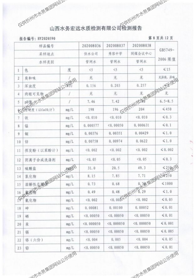 忻州城區(qū)公共供水水源水、出廠水、管網(wǎng)水、管網(wǎng)末梢水2020年8月份水質(zhì)信息公示