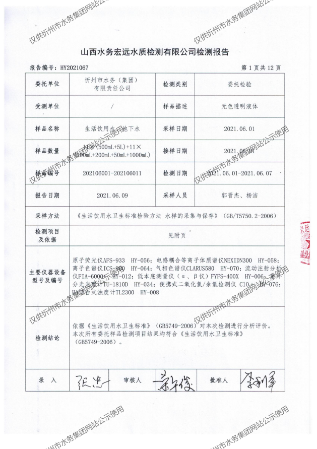 忻州城區(qū)公共供水水源水、出廠(chǎng)水、管網(wǎng)水、管網(wǎng)末梢水2021年6月份水質(zhì)信息公示